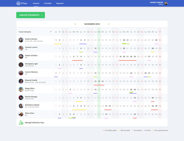 In iFlow “Evenimentele” sunt modificari aduse programului de lucru stabilit de catre angajator. Acestea sunt de patru tipuri: concediu de odihna, alte concedii, ore suplimentare si invoiri.
