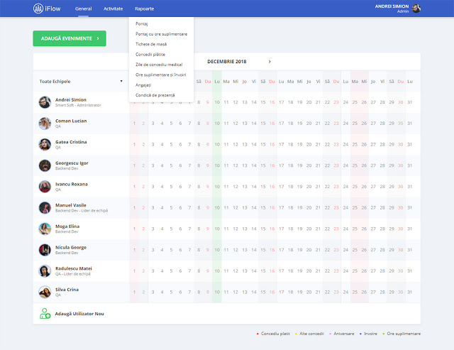 - Iti aduce o interfata in care ai evidenta orelor suplimentare, a invoirilor si a zilelor de concediu pentru intregul personal.
