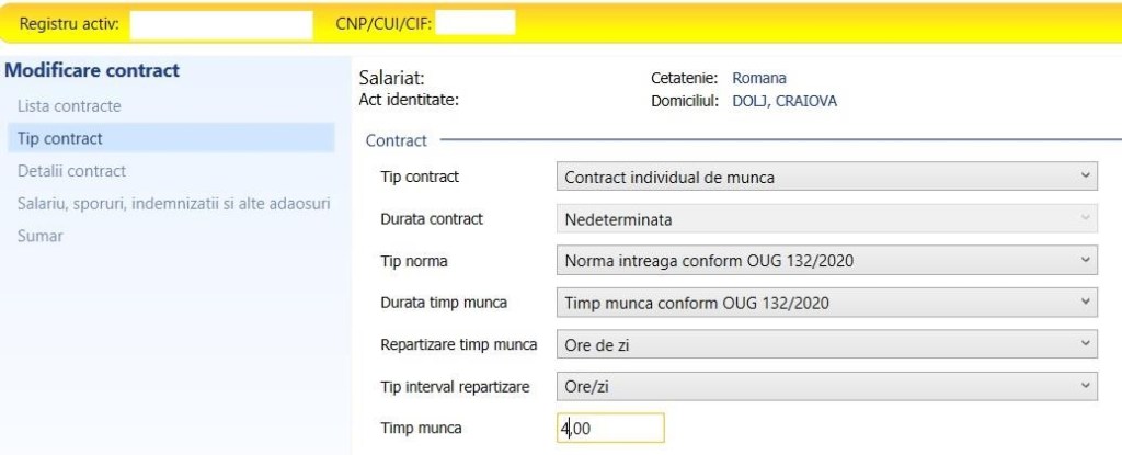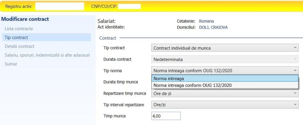 Corespunzator tipului de norma Norma intreaga conform OUG 132/2020, durata timpului de munca se modifica in Timp Munca conform OUG 132/2020, conform imaginii de mai jos.