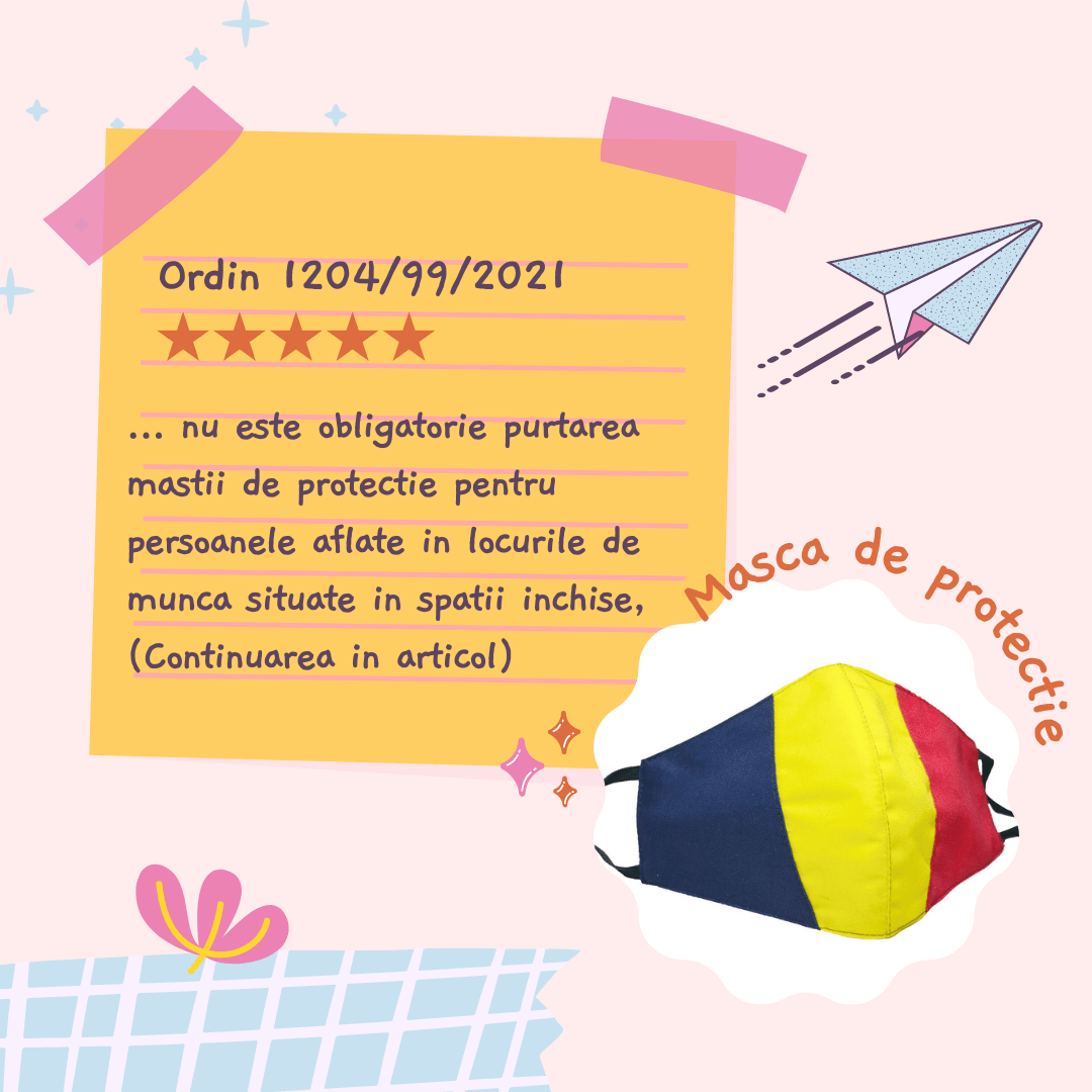 Conform Ordinului comun al Ministrului Sanatatii si al Ministrului Afacerilor Interne, nr. 1204/99/2021 si publicat in Monitorul Oficial, Partea I, nr. 683 din 09 iulie 2021, incepand cu data de 13 iulie 2021, nu este obligatorie purtarea mastii de protectie pentru persoanele aflate in locurile de munca situate in spatii inchise, cu conditia prezentei unui numar de maximum 10 persoane pentru care au trecut 10 zile de la finalizarea schemei complete de vaccinare si cu asigurarea unei distante de un 1 metru intre ele, iar in zonele respective nu este permis accesul publicului sau al altor lucratori. Exceptia nu se aplica in cazul spatiilor inchise comune.